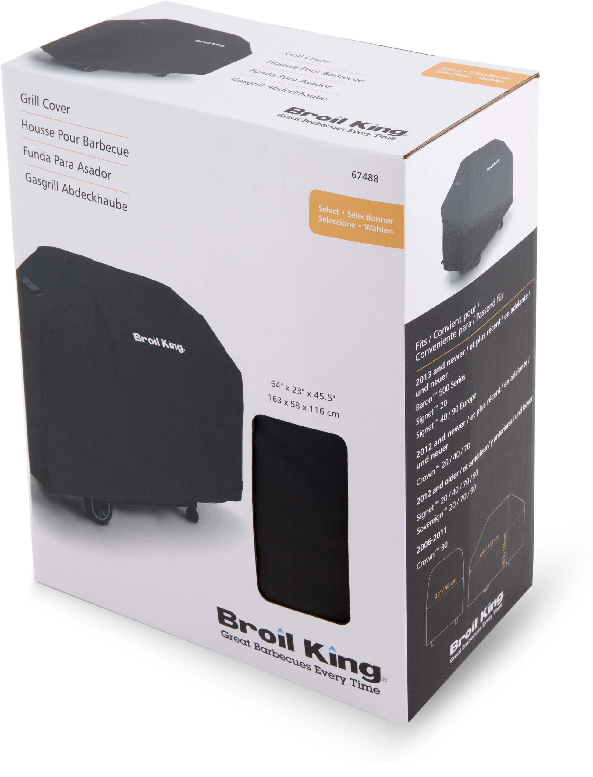 64 po x 23 po x 45,5 po. PEVA exclusif/tissu de polyester. Convient aux grils à gaz Broil KingMDsuivants : Série BaronMC 500, CrownMC 20, 40 (Après 2012), Série SignetMC (Avant 2013), SignetMC 20 (2013-2015), SovereignMC 20/70/90 (Avant 2013).
