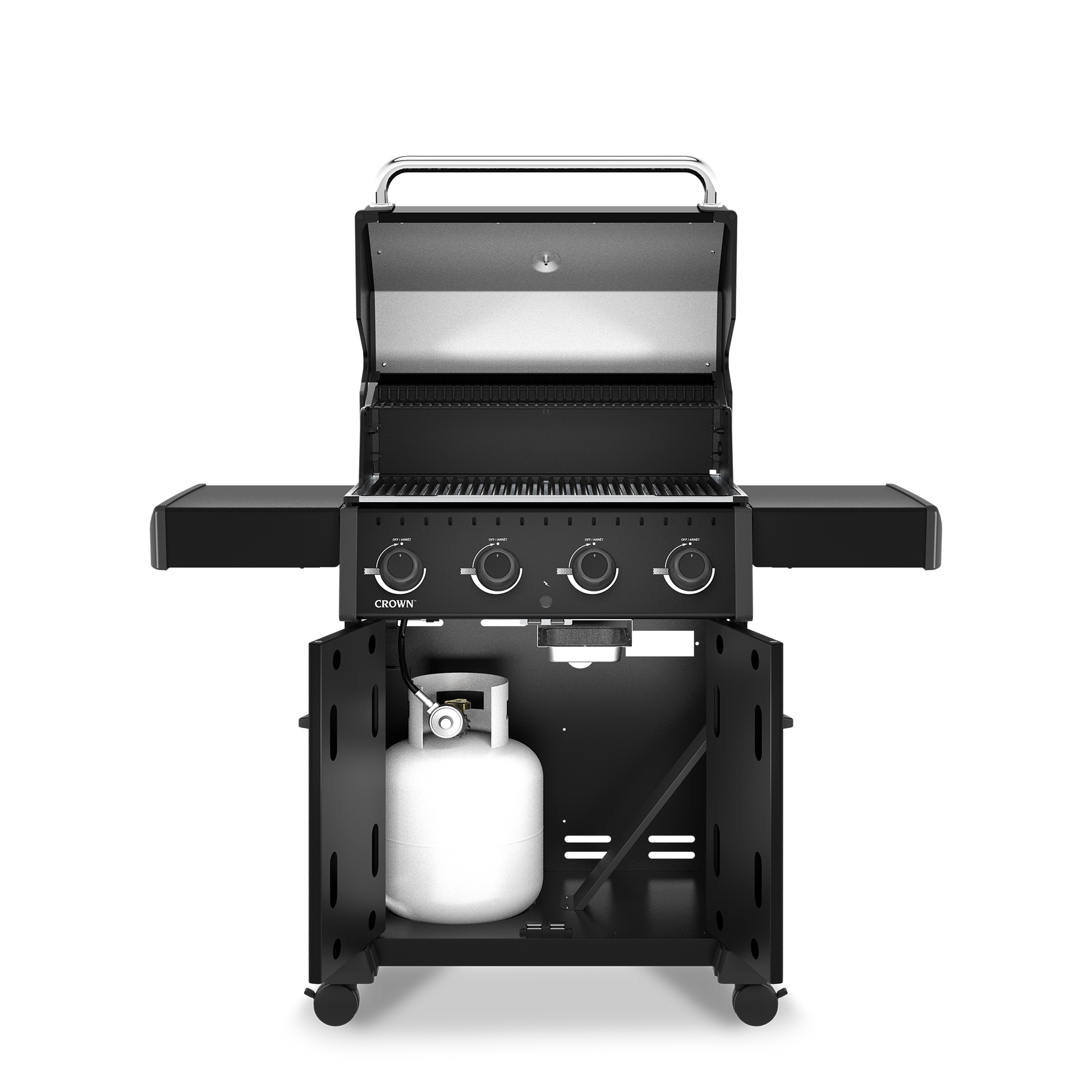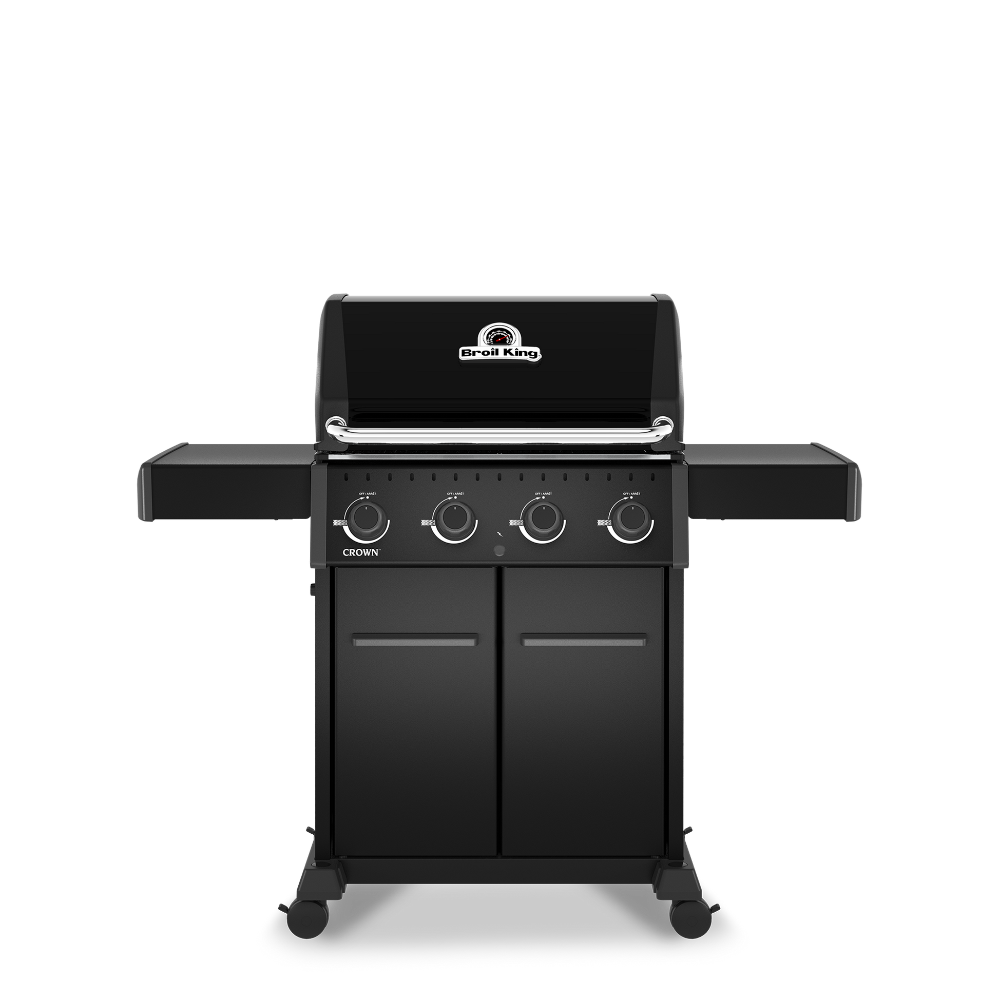 La série CrownMC 400 de Broil King® offre une surface principale de cuisson de 460 po2 avec un robuste boîtier en aluminium coulé, quatre brûleurs Dual-TubeMC en acier inoxydable, un système de cuisson Flav-R-WaveMC en acier inoxydable et un allumage électronique. Tous les barbecues de la série CrownMC 400 comprennent des grilles de cuisson en fonte ultra-robuste à trois positions, des tablettes latérales rabattables noires et une base avec armoire intégrée.