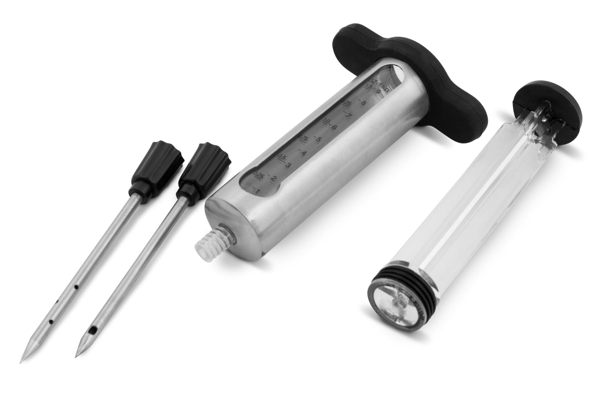 Un excellent accessoire pour injecter de la saveur dans vos coupes de viande. Comprend une grande et une petite aiguille, ainsi qu’une fenêtre avec marqueurs gradués afin que vous puissiez surveiller la quantité de marinade injectée. Se démonte pour un nettoyage facile.