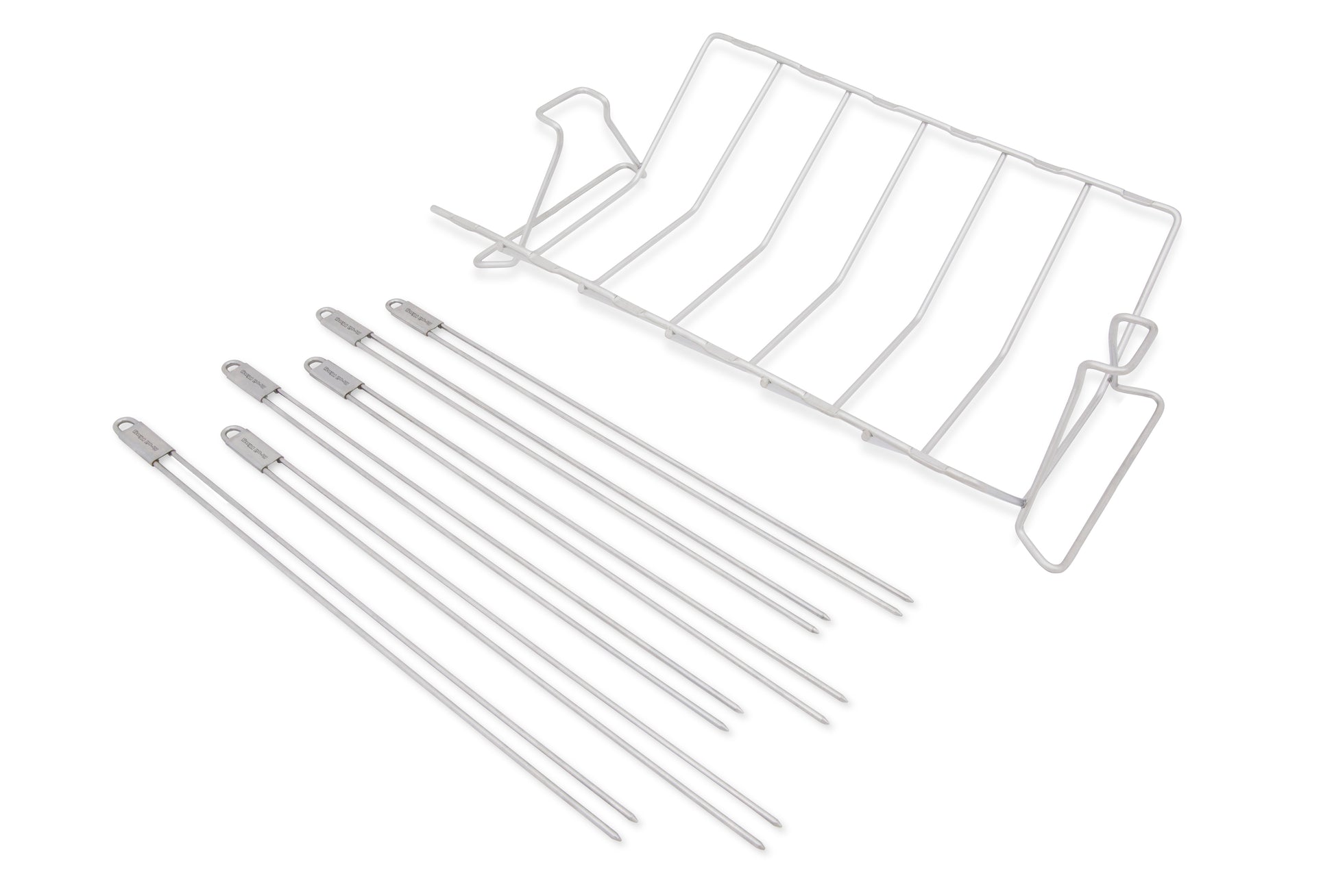 Idéal pour rôtis, volaille et kebabs sur un côté, et pour jusqu’à six carrés de côtes de l’autre, faites rôtir jusqu’à six carrés de côtes levées. L’ensemble de grilles multiples comprend un support pour côtes et rôtis, et six brochettes à deux broches en acier. Comme accessoire, cet ensemble est tout ce qu’il y a de plus polyvalent.