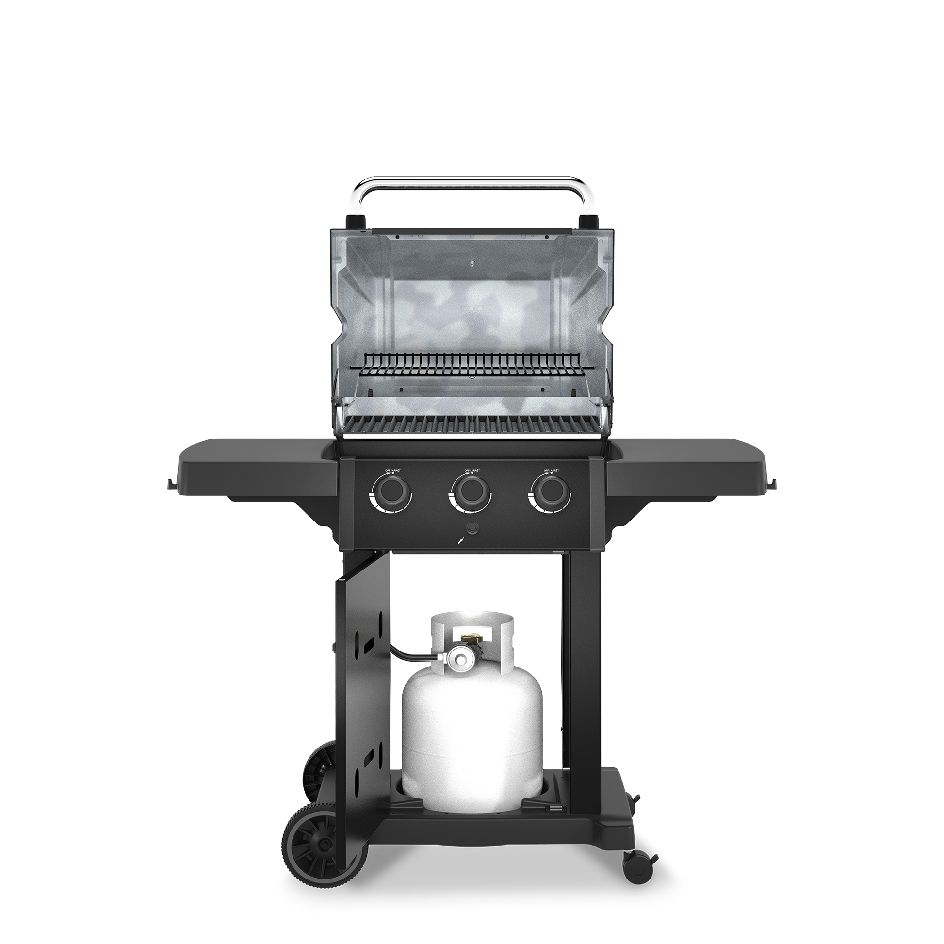 Le modèle MonarchMC 320 offre une surface principale de cuisson de 213 cm2 (330 po2) et comprend 3 brûleurs en acier inoxydable Dual-TubeMC, des grilles de cuisson réversibles en acier coulé de service rigoureux, un système de cuisson en acier inoxydable Flav-R-WaveMC, et un allumage électronique. Le MonarchMC 320 offre des tablettes latérales rabattables en acier peint, et une base avec armoire intégrée.