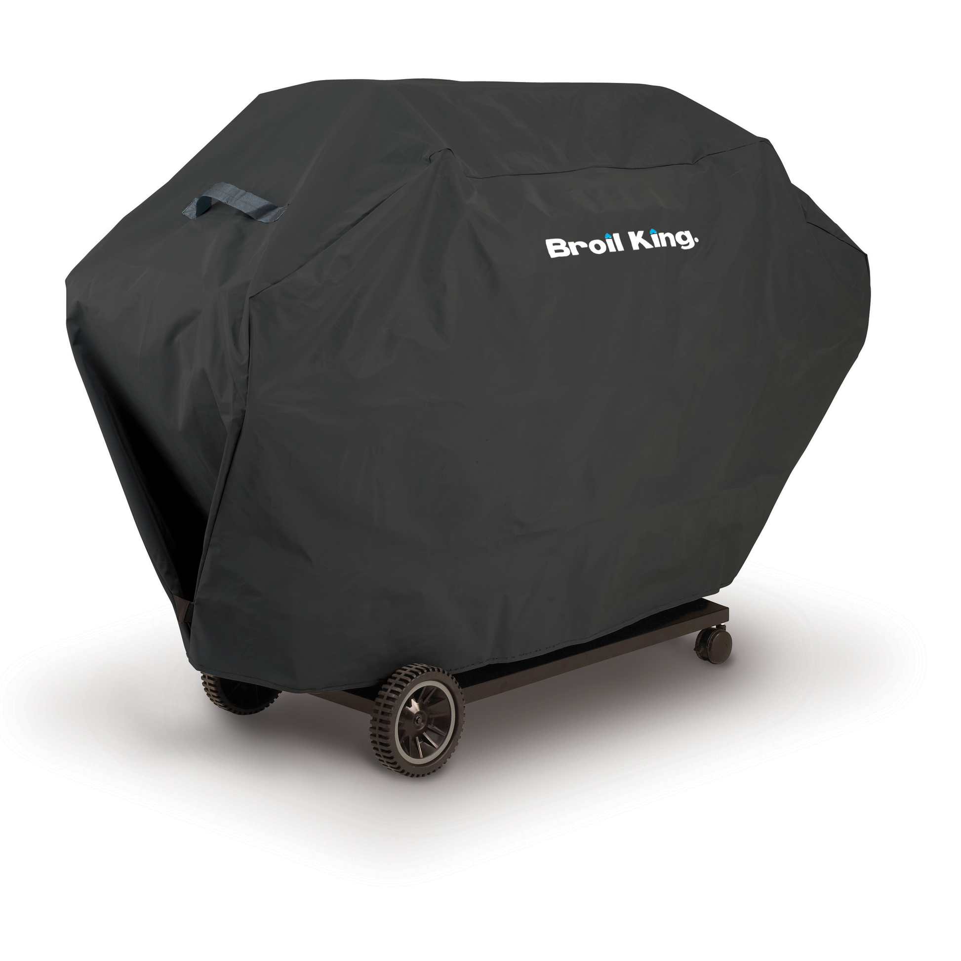 Protect your investment with the Broil King select grill cover. Constructed of weather resistant PVC, this cover is engineered to protect your gas grill to enjoy for the years to come. Additional features polyester handles for easy moving, hook and loop tabs to secure the cover around the grill and hanging loops for convenient storage. 51 in. x 23 in. x 46 in. Select PEVA/polyester fabric. Fits the following Broil King gas grills Baron 300 Series, Monarch Series (2014 and newer).