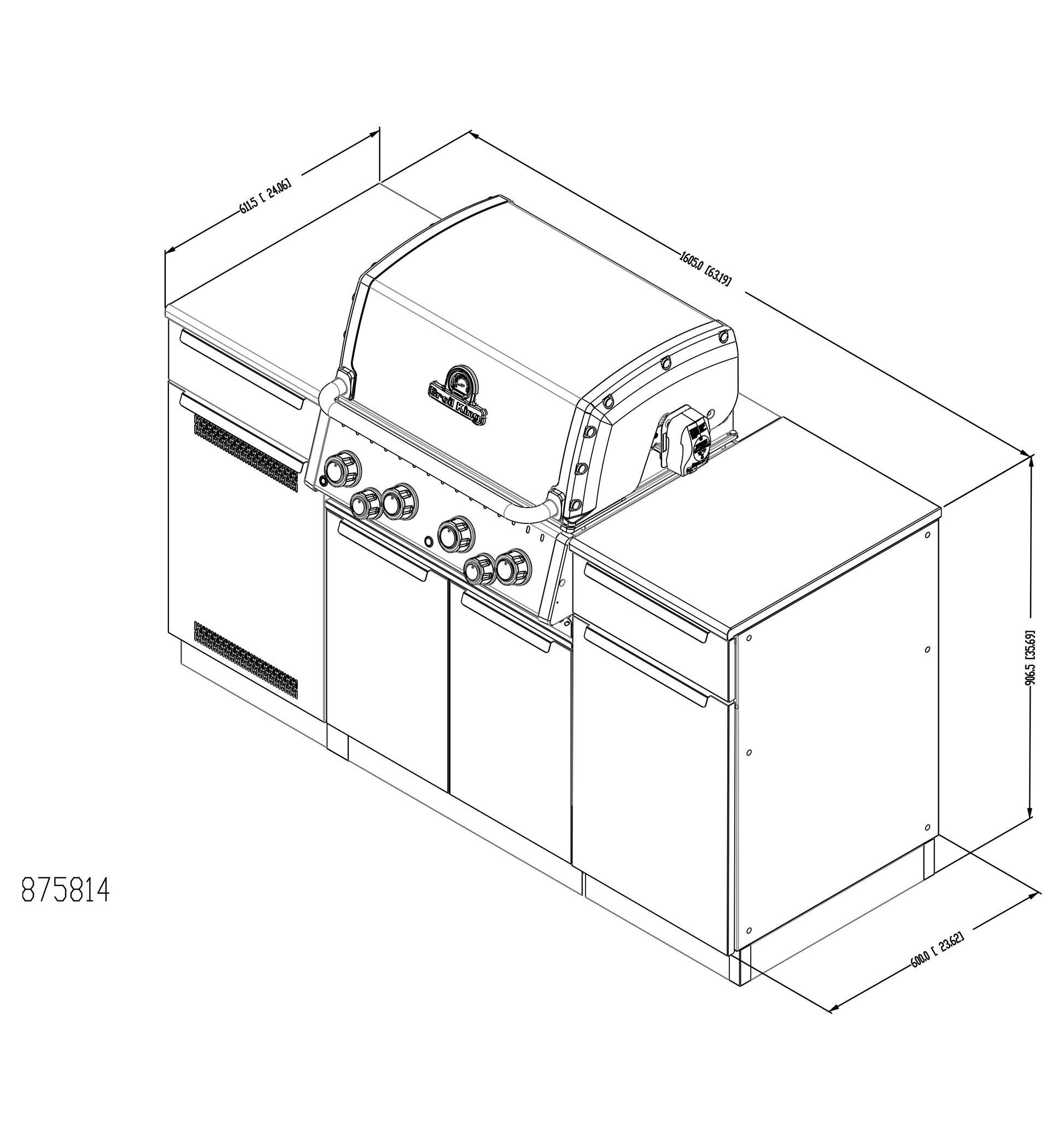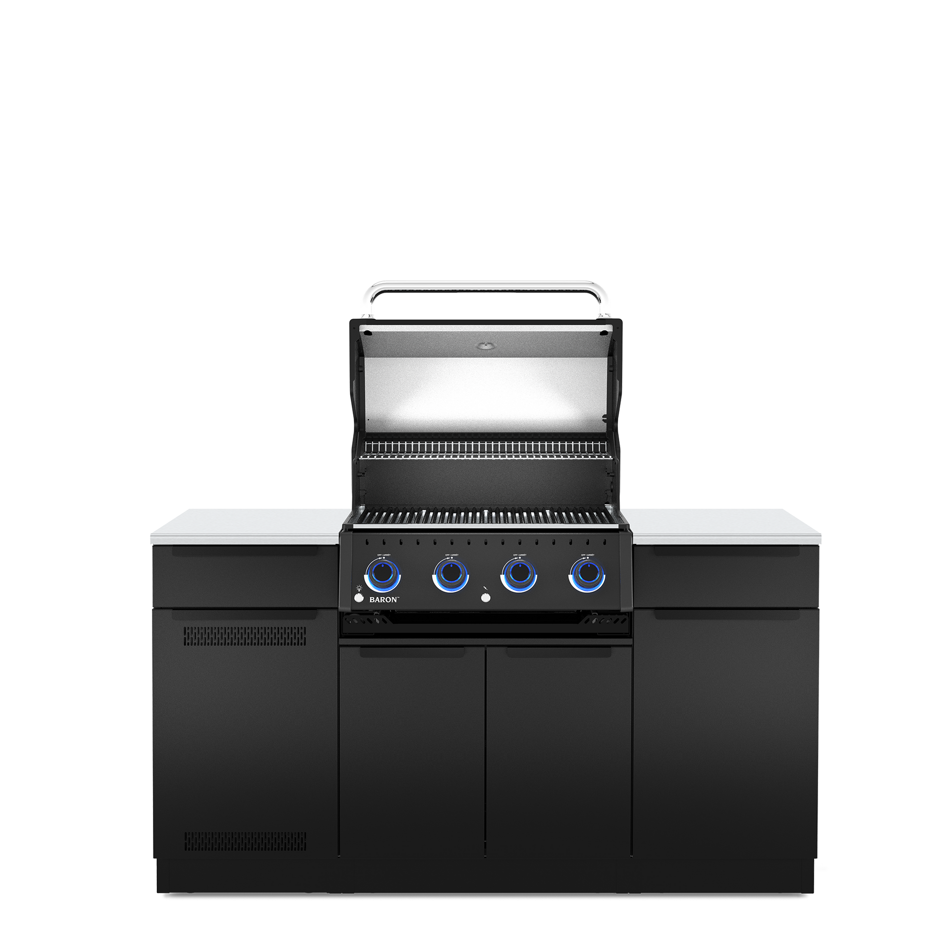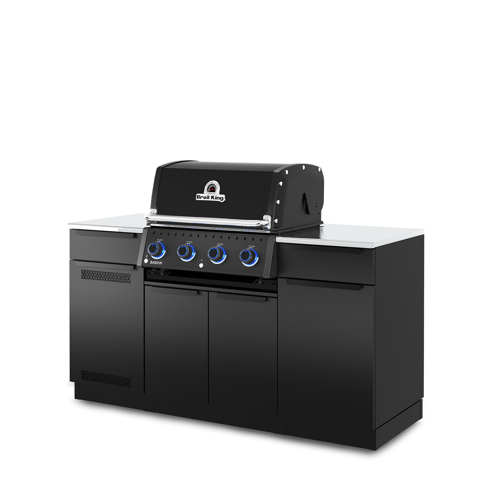 The Broil King® Baron 420i Shadow island outdoor kitchen features 460 sq. in. of primary cooking surface and includes 4 stainless steel Dual-Tube™ burners, illuminated control knobs, Apex stainless steel cooking grids, stainless steel warming rack, stainless steel Flav-R-Wave™ cooking system, and electronic ignition. The 490i features soft close galvanized stainless steel cabinet drawers, a pull out tank drawer (LP) and pull out cabinet with trash and recycling bins. Premium cast iron griddle is included.