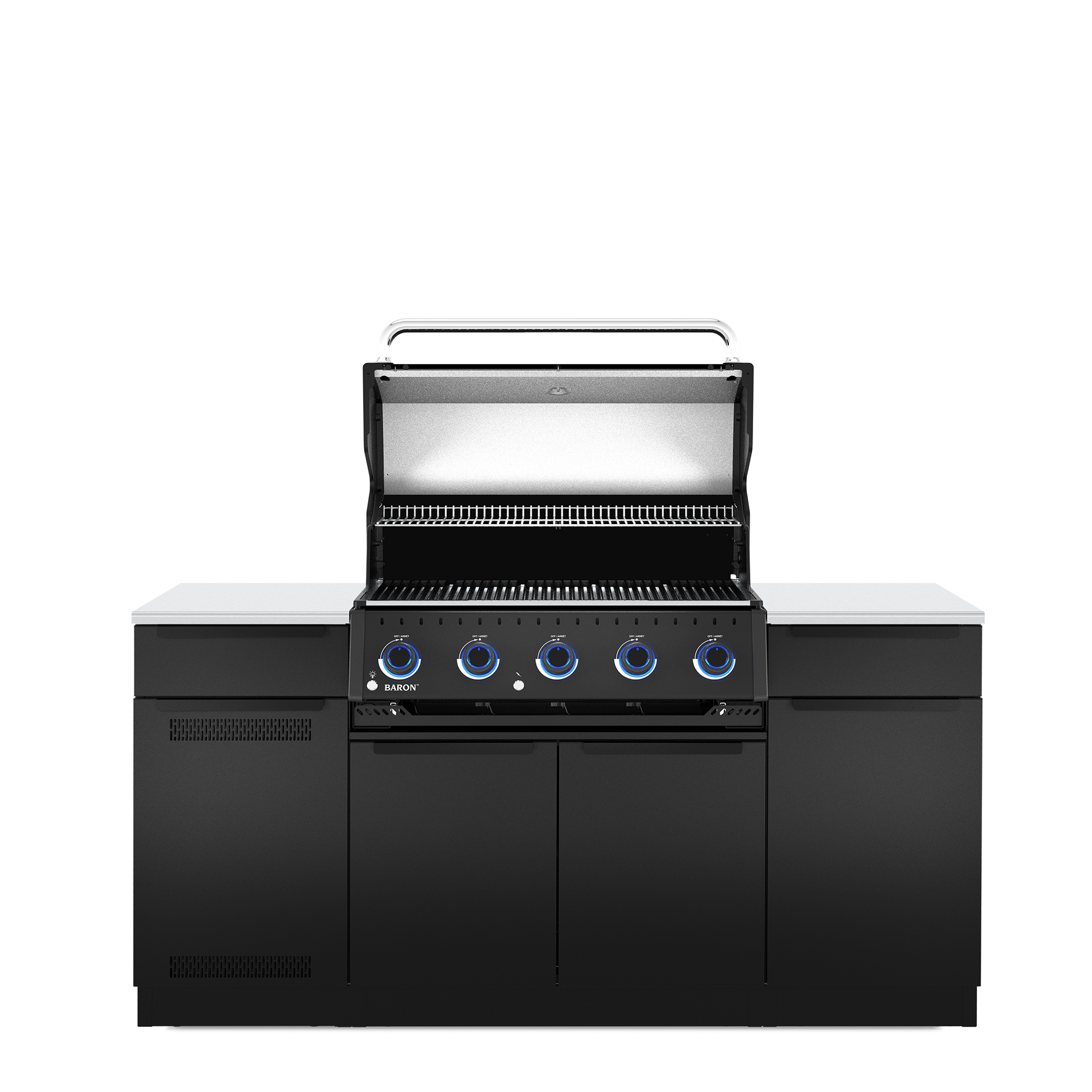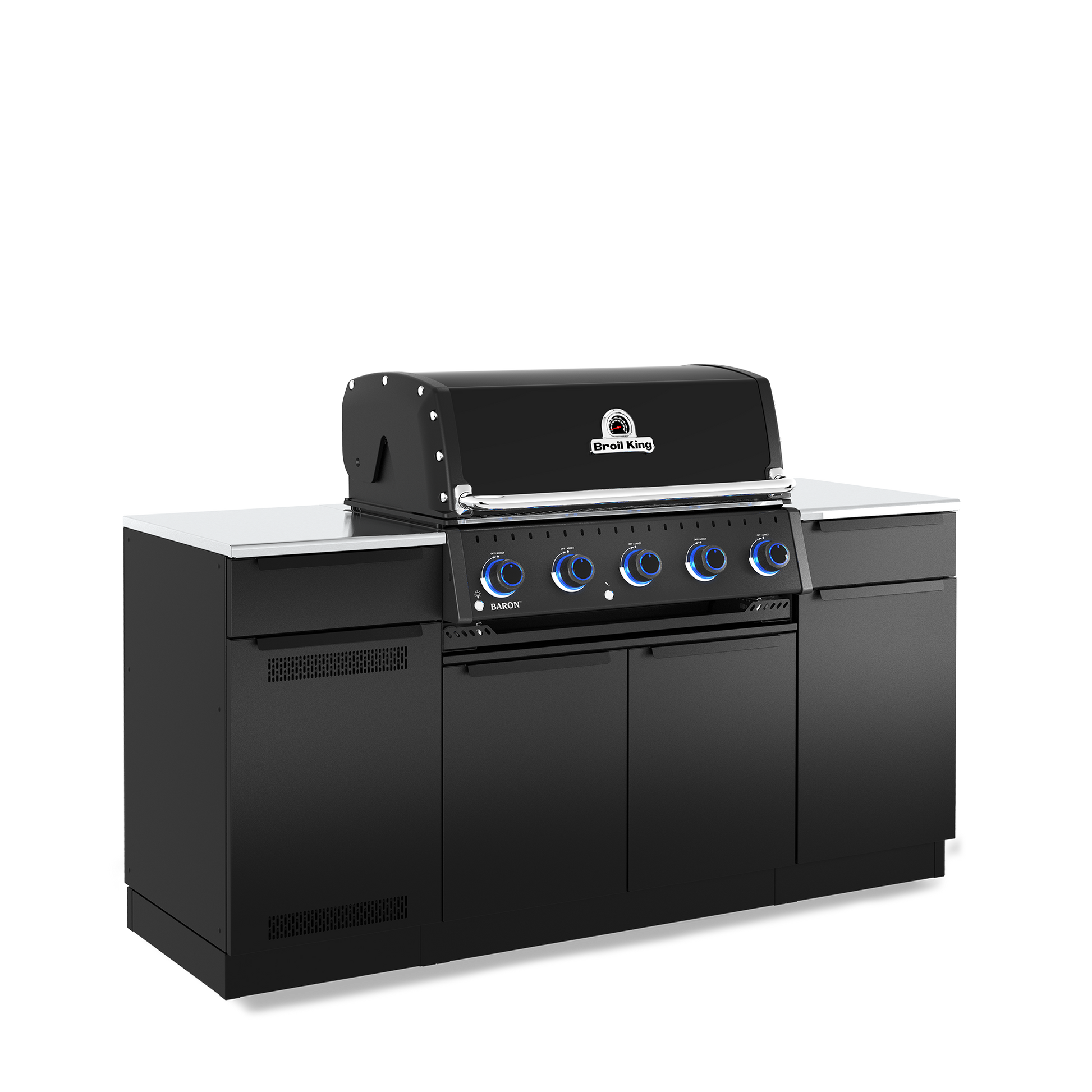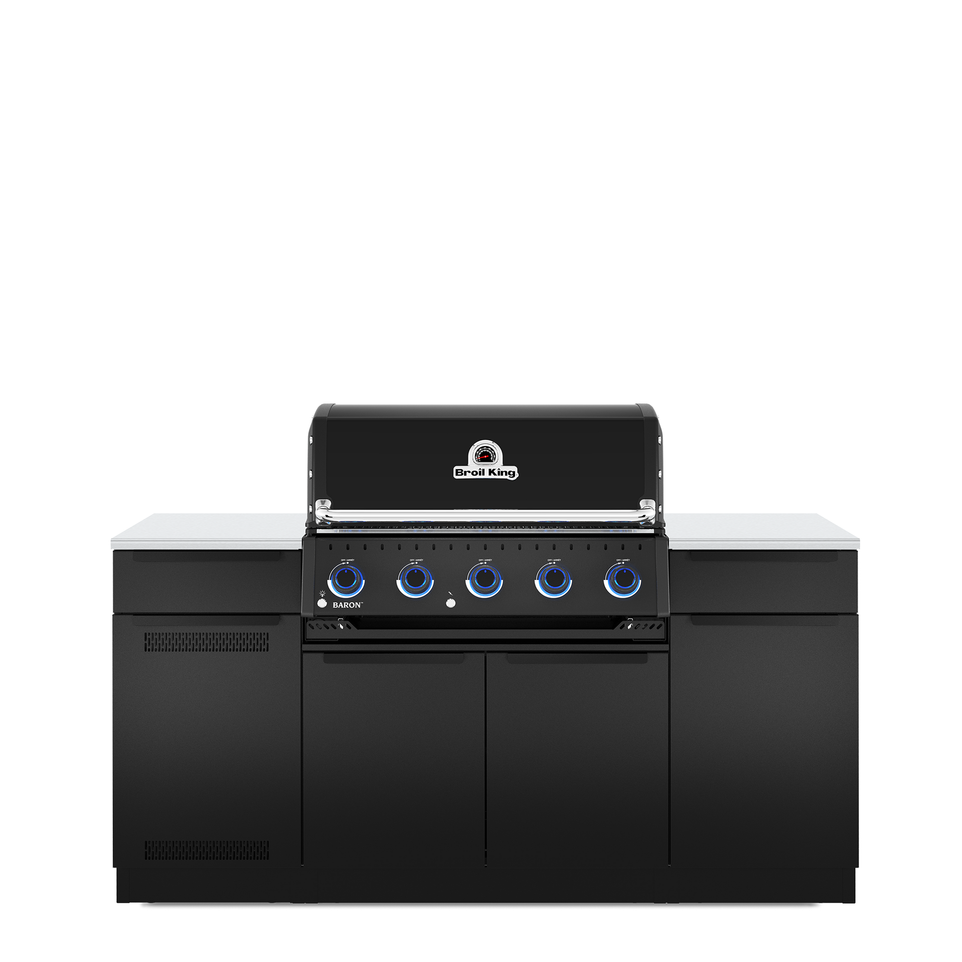 Baron Built-In Islands are a practical and stylish solution that delivers unmatched grilling performance, abundant & convenient storage, and a sleek design to elevate your backyard experience. The Broil King® Baron 520i Shadow island outdoor kitchen features 500 sq. in. of primary cooking surface and includes 5 stainless steel Dual-Tube™ burners, illuminated control knobs, Apex stainless steel cooking grids, stainless steel warming rack, stainless steel Flav-R-Wave™ cooking system, and electronic ignition. The 590i features soft close galvanized stainless steel cabinet drawers, a pull out tank drawer (LP) and pull out cabinet with trash and recycling bins. Premium cast iron griddle is included.