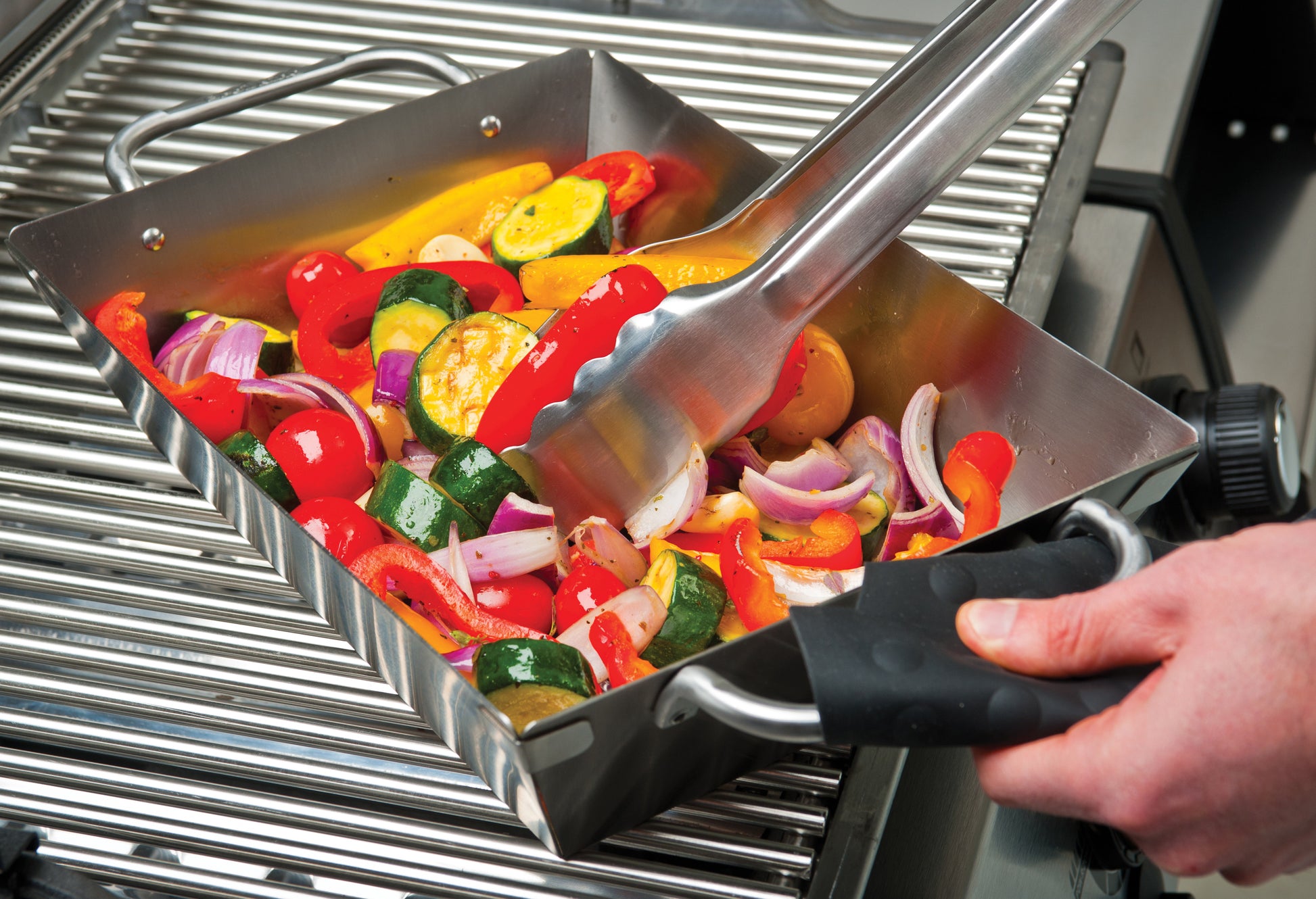 The Broil King Imperial deep dish wok topper is crafted with high grade 1.2 mm stainless steel, the uncommonly large 13 in. x 9.75 in. design gives you more cooking space and the deep dish keeps foods contained within the wok. Oversized 10 mm stainless steel handles and raised square perforations add to its rigidity, the raised perforations also help keep food from sticking.