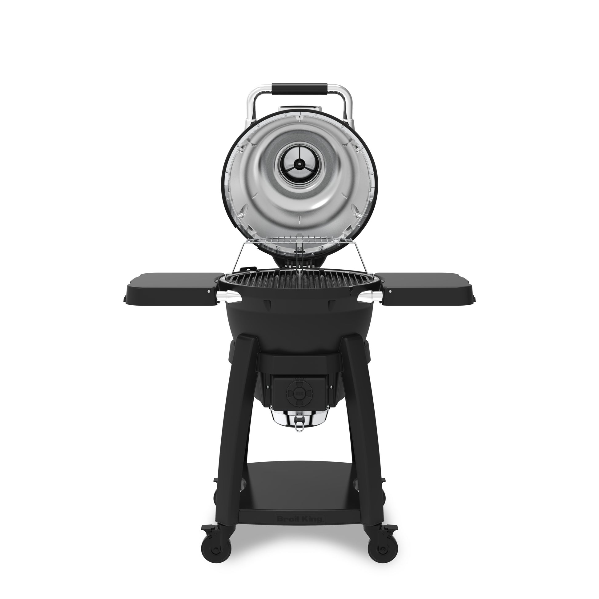 The newly designed Broil King Keg Kamado Charcoal Grill delivers a next-level fuel efficiency and heat retention with a ceramic diffuser cooking system. With 635 Sq. in. of total cooking space on two levels, it offers the flexibility to cook for any occasion. The cast aluminum firebox and lid locks in heat for consistent temperature control and moisture retention. A heavy-duty cast iron cooking grid ensures excellent heat retention, while upper and lower dampers provide precise temperature control for both low-and-slow smoking and high-heat searing. Removable resin side shelves with tool hooks add convenience, and resin handles with built-in bottle openers blend style with function. A premium thermometer ensures accurate readings, and the latch-and-lock lid keeps heat sealed in. Finished in sleek black durable steel, it's built to last with a 15-year warranty on the cook box, lid, and cooking grids, and a 2-year warranty on remaining parts and paint (3 years on iQue components).