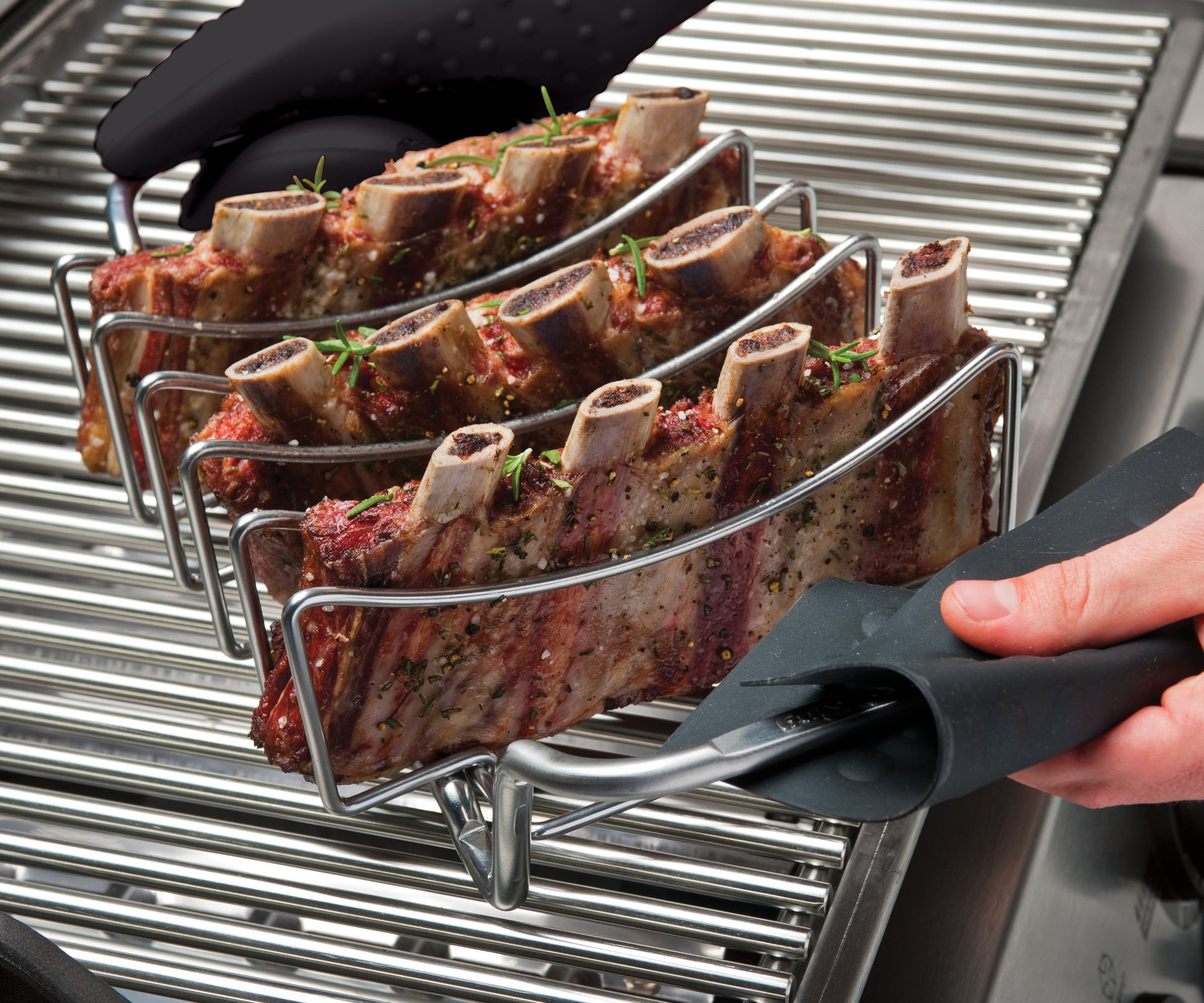The Broil King Imperial professional rib and roast rack accommodates 5 racks of ribs within an ultra durable high grade stainless steel wire frame, the multi-use design also accommodates large cuts of meat for roasting on the upper concave wire structure. Oversized 10 mm handles support the entire rack and allows it to be easily transferred from 1 part of the grill to another.